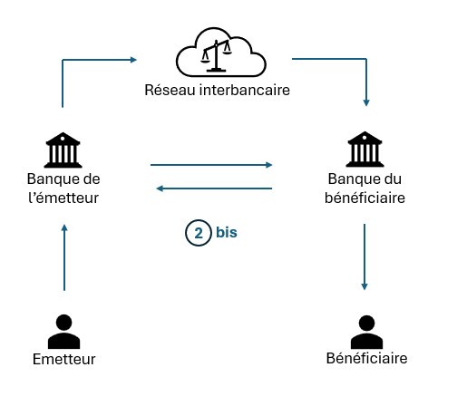 L’établissement financier du donneur d’ordre réalise ensuite des vérifications (compte suffisamment provisionné ou autorisation de découvert ainsi que la conformité des coordonnées bancaires du bénéficiaire), débite le compte de l’émetteur et achemine les fonds via un réseau sécurisé.